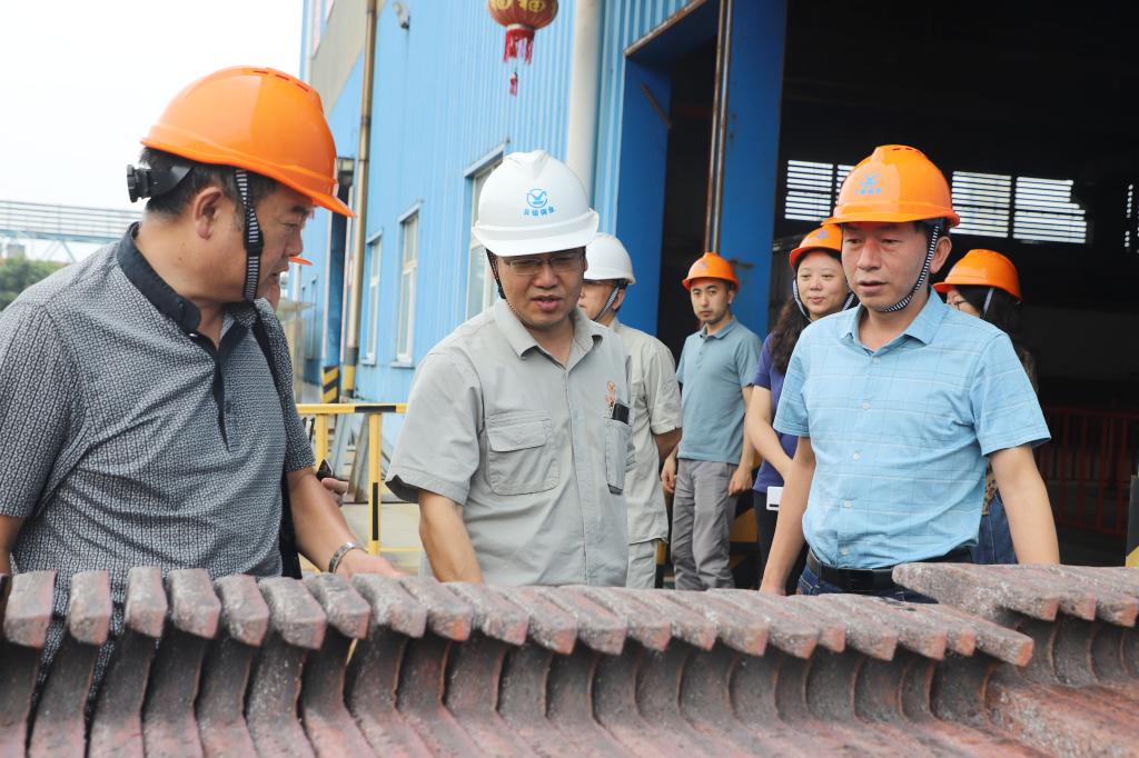 调研组观看了铜业分公司宣传片,重点参观了熔炼和电解系统的运行情况。在主厂房前,陈钢详细介绍了铜精矿原料结构、进口矿的主要来源、矿料入炉品位、产出的阳极板品质如何、阴极铜和金银等产品的纯度和销售等情况。