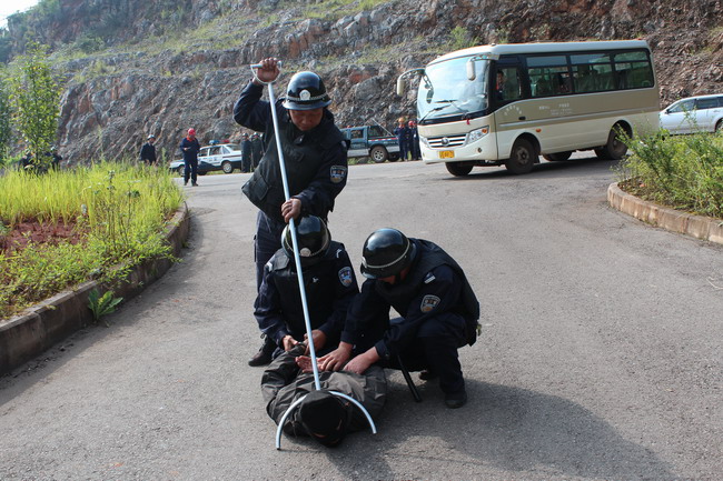 演练设置为早上9点30分左右,在通勤车乘坐点,一群身份不明的人员在职工乘坐通勤车下班时进行突然袭击,对车间设施进行破坏,其中3名“暴恐分子”在中巴车内挟持了3名职工,守护精选工段的保卫人员接到报警后,两名保卫人员立即对恐怖分子进行阻击,另外一名保卫人员立即把情况上报给反恐小组办公室,反恐领导小组迅速启动应急方案。
