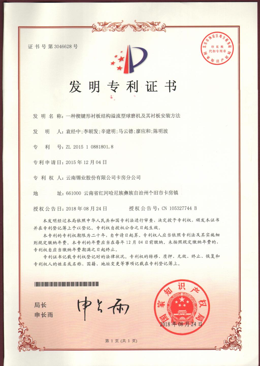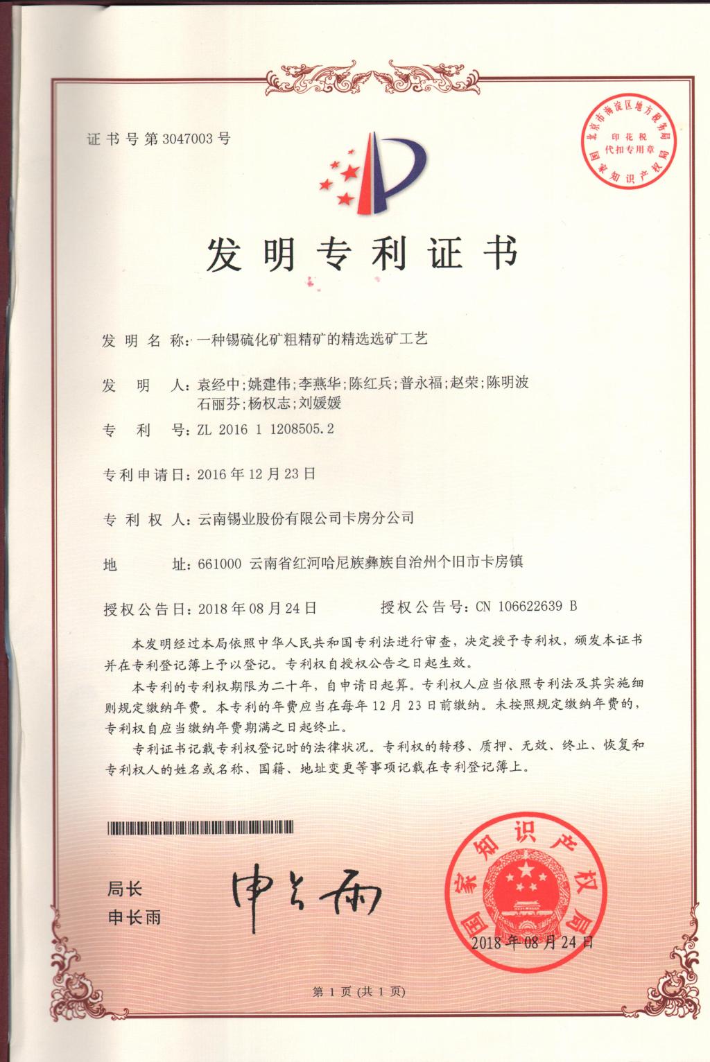 近日,卡房分公司申报的发明专利《一种楔键形衬板结构溢流型球磨机及其衬板安装方法》《一种锡硫化矿粗精矿的精选选矿工艺》再获国家知识产权局正式授权,并授予国家发明专利证书。这是今年继8月份该分公司申报的发明专利《一种共生硫化矿中富含高砷硫精矿的降砷选矿工艺》《一种皂类捕收剂GY-10药剂溶液的溶解配制方法》获国家发明专利证书之后,再获两项发明专利授权。