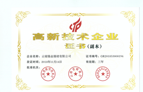 2018年,锡材公司经过评审、公示,再次获得认定,取得“高新技术企业证书”。自2009年锡材公司首次申报高新技术企业并获得认定开始,已连续四次申报成功,一共连续12年位居高新技术企业之列。