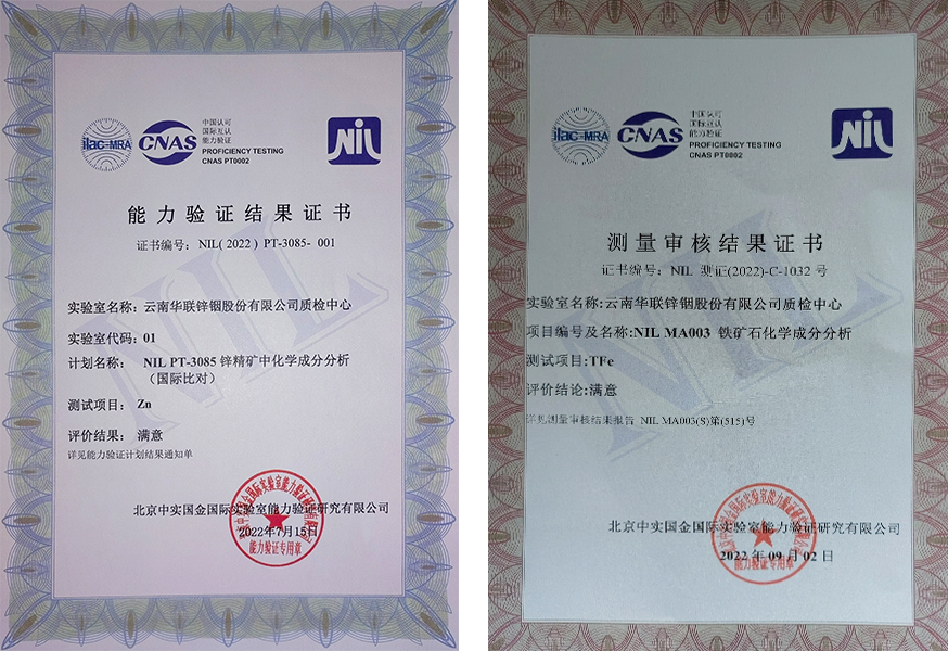 华联锌铟公司质检中心于2022年5月参加北京中实国金实验室能力验证研究有限公司申报的国家级实验室认可领域检测项目,并顺利通过锌精矿、铁矿石化学成分分析国际检测认可。此次锌精矿化学成分分析中Zn能力验证国际比对,铁矿石化学成分分析TFe测量审核,双双获得评价结果为满意的证书。
