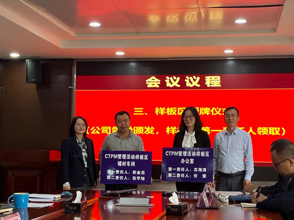 会议选定了锡材车间和办公室为CTPM管理活动样板区,并对样板区负责人进行授牌。华谋项目组从项目目标,项目方法、工作计划、团队建设和沟通机制等方面进行详细安排。