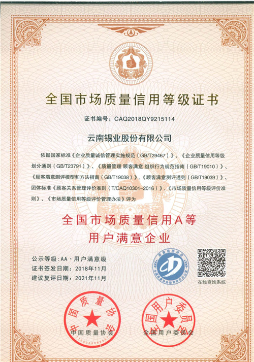 太阳集团tyc4633积极参加中国质量协会组织的“2018年度市场质量信用等级评价”活动,通过企业申请、行业协会推荐、第三方专业机构评价、专家评审、委员会审定、征询意见等程序审核,对申报企业的质量信用意愿、质量保障能力、市场经营能力等三个一级指标及若干个二、三级指标进行综合评价,全面综合考核企业的诚信建设与市场质量信用管理能力和水平,太阳集团tyc4633荣获“2018全国市场质量信用AA等用户满意企业” 荣誉证书及奖牌。