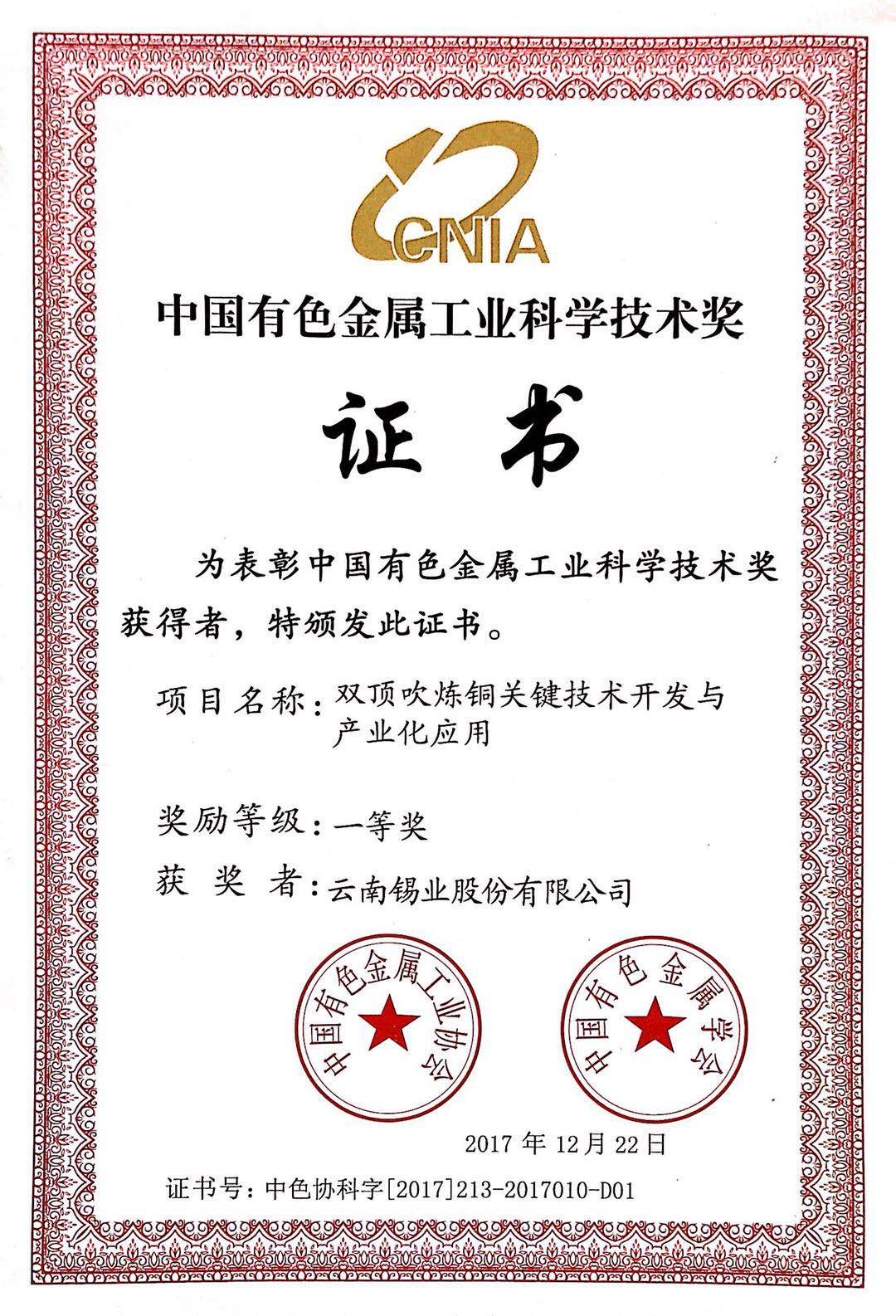 近日,经中国有色金属工业协会、中国有色金属学会评审及公示,云锡股份公司铜业分公司“双顶吹炼铜关键技术开发与产业化应用”荣获中国有色金属工业科学技术一等奖。