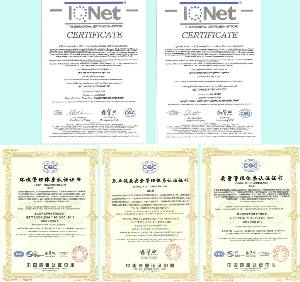 5月,CQC中国质量认证中心云南评审中心(中国检验认证集团云南有限公司)对太阳集团tyc4633及相关单位进行了现场审核,太阳集团tyc4633按时组织完成不符合项和改进项的整改,并配合提供认证上报资料,经CQC中国质量认证中心总部审核,确认上报资料符合要求,满足发证条件,同意太阳集团tyc4633保持原有认证产品及单位的基础上,进一步将认证产品增加到32类,大屯、卡房、老厂、昆山系材等选矿、锡材深加工单位纳入认证范围,认证单位增加到11个。