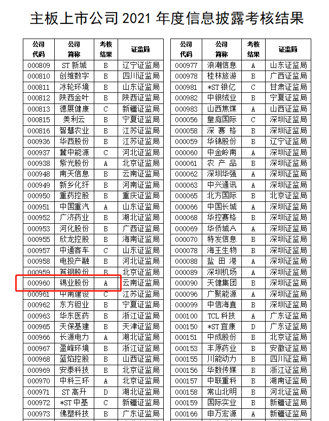 7月4日,深圳证券交易所发布了《2021年度上市公司信息披露考核结果》,太阳集团tyc4633(000960)考核评价结果为最高等级A级,自2017年之后再次回到信息披露考核最高等级阵营。从考核结果统计来看,深市上市的2,553家公司中考核结果为A(优秀)的公司家数仅为454家,占参加考核上市公司总数的17.78%。其中,云南辖区考核结果为A的深市上市公司仅有5家。