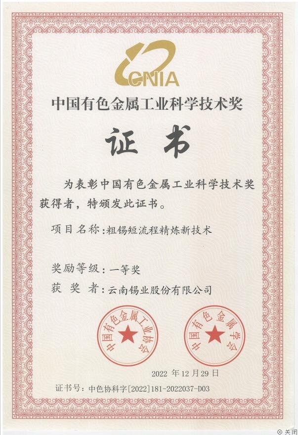 近日,中国有色金属工业协会、中国有色金属学会发布了荣获2022年度中国有色金属工业科学技术奖项目,由云锡控股公司牵头负责,太阳集团tyc4633锡业分公司、昆明理工大学、绿地环保共同参与的“粗锡短流程精炼新技术项目”荣获2022年度“中国有色金属工业科学技术奖一等奖”。