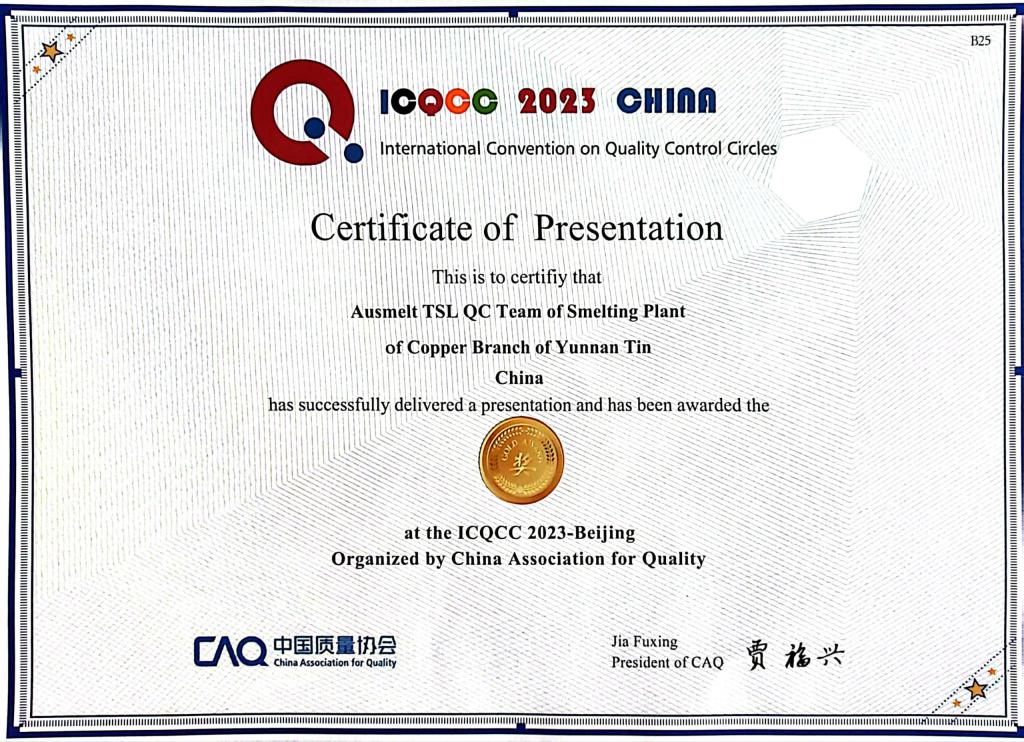 近日,2023年国际质量管理小组会议传来了好消息,太阳集团tyc4633铜业分公司熔炼车间顶吹QC小组《降低炉壳钢水套堵塞次数》与锡业分公司炼渣车间烟化炉QC成果斩获国际质量管理小组金奖。
