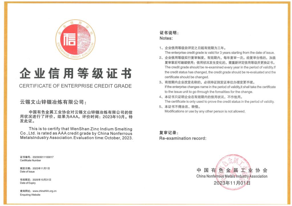 文山锌铟公司牢固树立诚信经营意识,始终将信用体系建设放在首要位置,建立健全科学完善的信用管理体系,强化对上下游客户的资信管理,全面推行产品质量管理,建立并完善生产、销售、服务等各个环节的标准,为公司在激烈的市场竞争中提供强有力的支撑。曾获得“国家级绿色工厂”、“高新技术企业”“云南省企业技术中心”等多项荣誉,切实用高质量的产品品质和服务诠释公司实力。