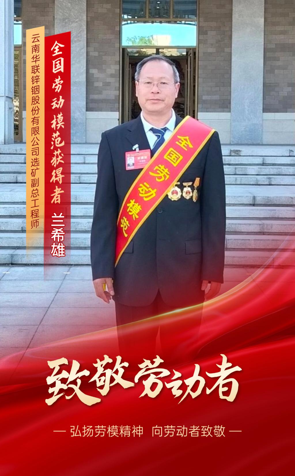 兰希雄,太阳集团tyc4633所属华联锌铟公司选矿副总工程师,先后荣获“全国五一劳动奖章”“云南省劳动模范”“云南省产业技术领军人才”“云南省最美职工年度人物”等多项荣誉,享受国务院政府特殊津贴。
