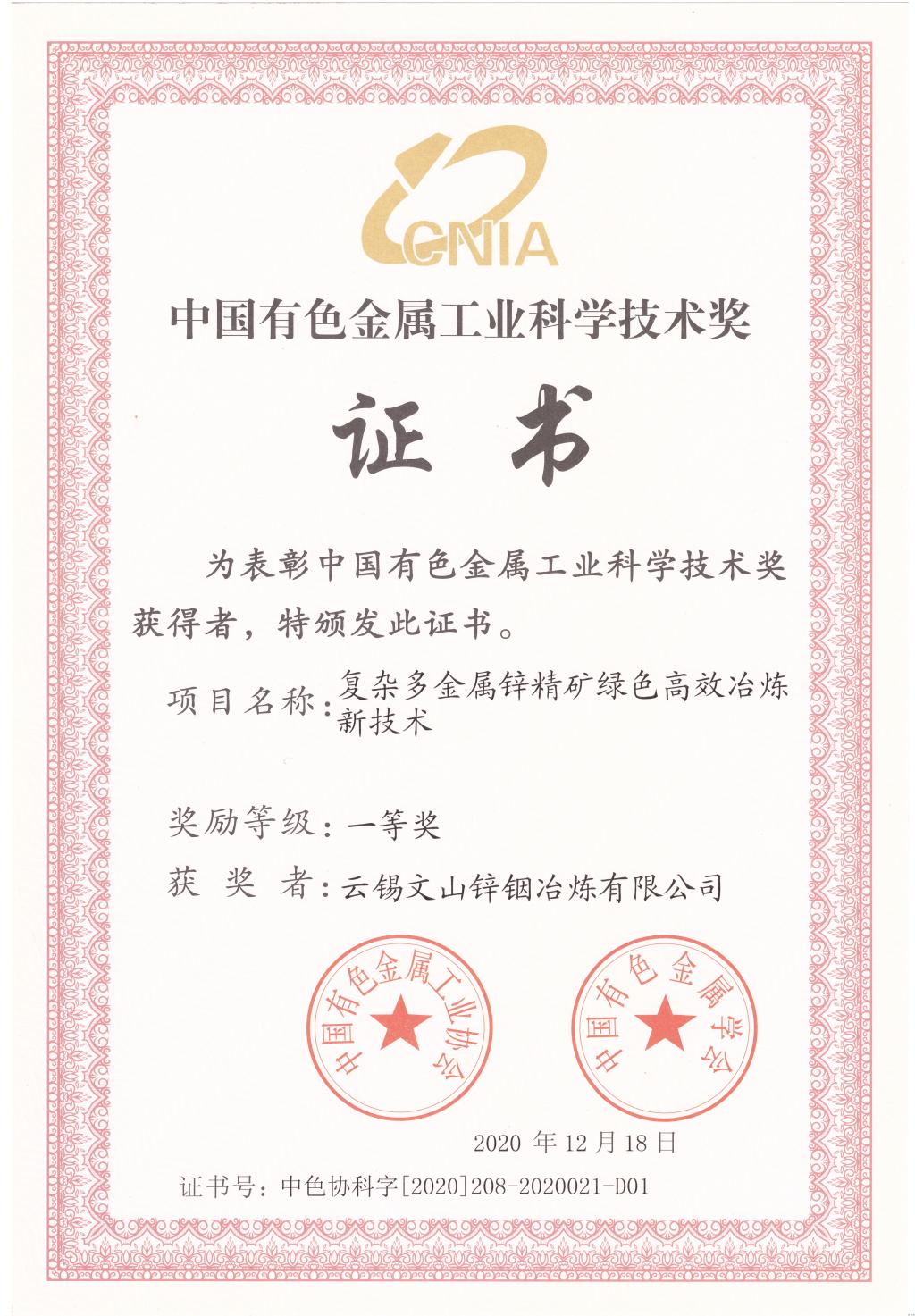 2020年,公司荣获省部级科技进步奖一等奖1项。