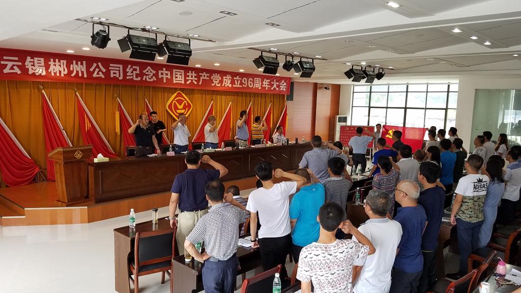 6月30日,云南锡业郴州矿冶有限公司隆重召开中国共产党成立96周年纪念大会,回顾党的历史和郴州公司发展历程,表彰先进,动员和激励广大党员干部坚定信心,增强“四个意识”,为实现郴州公司生产经营目标而努力奋斗。公司党政班子成员,各部门、科室负责人,党员代表及受表彰人员共61人参加。党委副书记、总经理张成俊主持会议。
